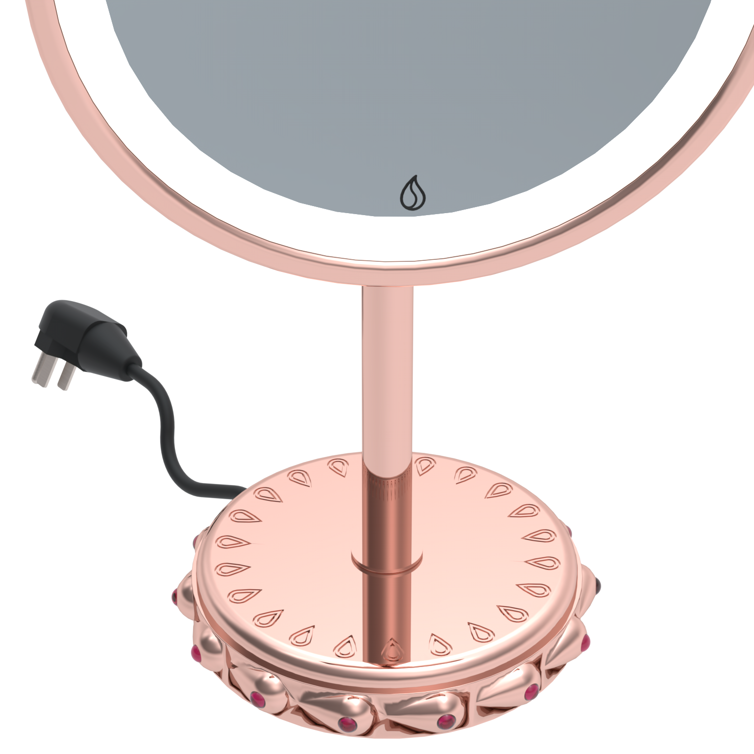 Who says a Vanity Mirror is not Fine Jewelry for your visage? Behold the magnificent Bejeweled Royal Illuminated Magnifying Vanity Mirror that highlights your beauty in regal light. The sophisticated and statuesque mirror, plated in stunning Matte or Polished 22K Rose Gold, poses atop a stunningly detailed artisan-made Signature Royal Base embellished with thirteen hand-cut Rhodolite Garnet Cabochon Gemstones set by our master artisan-jewelers. This artistic masterpiece is polished and plated to perfection and proudly displays Optical quality 7X Mirror Glass adorned with a Signature Lighted Emblem that signifies authenticity and well-being. Complex like your complexion, our extraordinary color-changing feature assists in balancing and refining your make-up application to guarantee you look your best in any environment throughout the day and evening from a candlelit dinner to a snowy ski run. Unequivocally the finest vanity mirror on the planet, this legacy work of art is a functional showpiece to help you Create Your Sanctuary and Indulge Your Senses®.