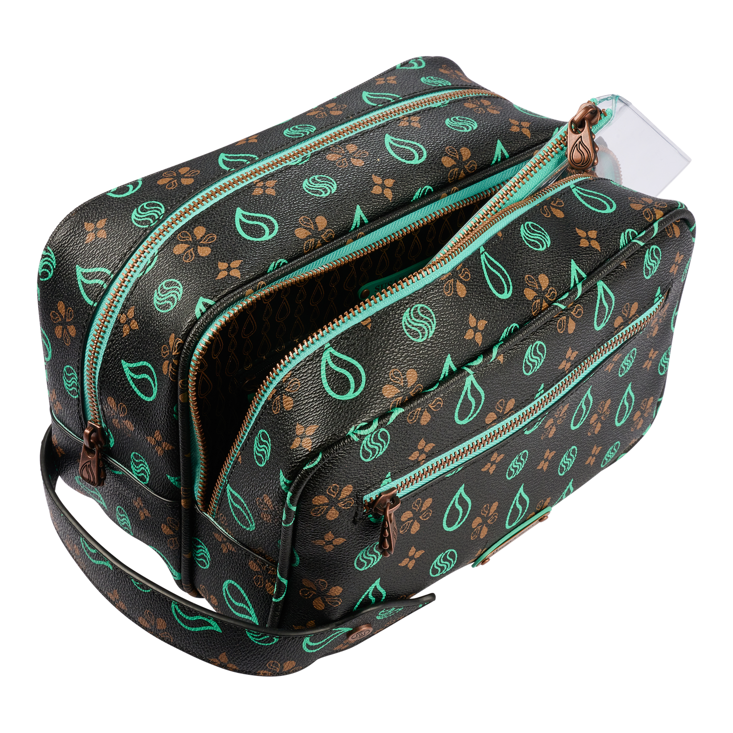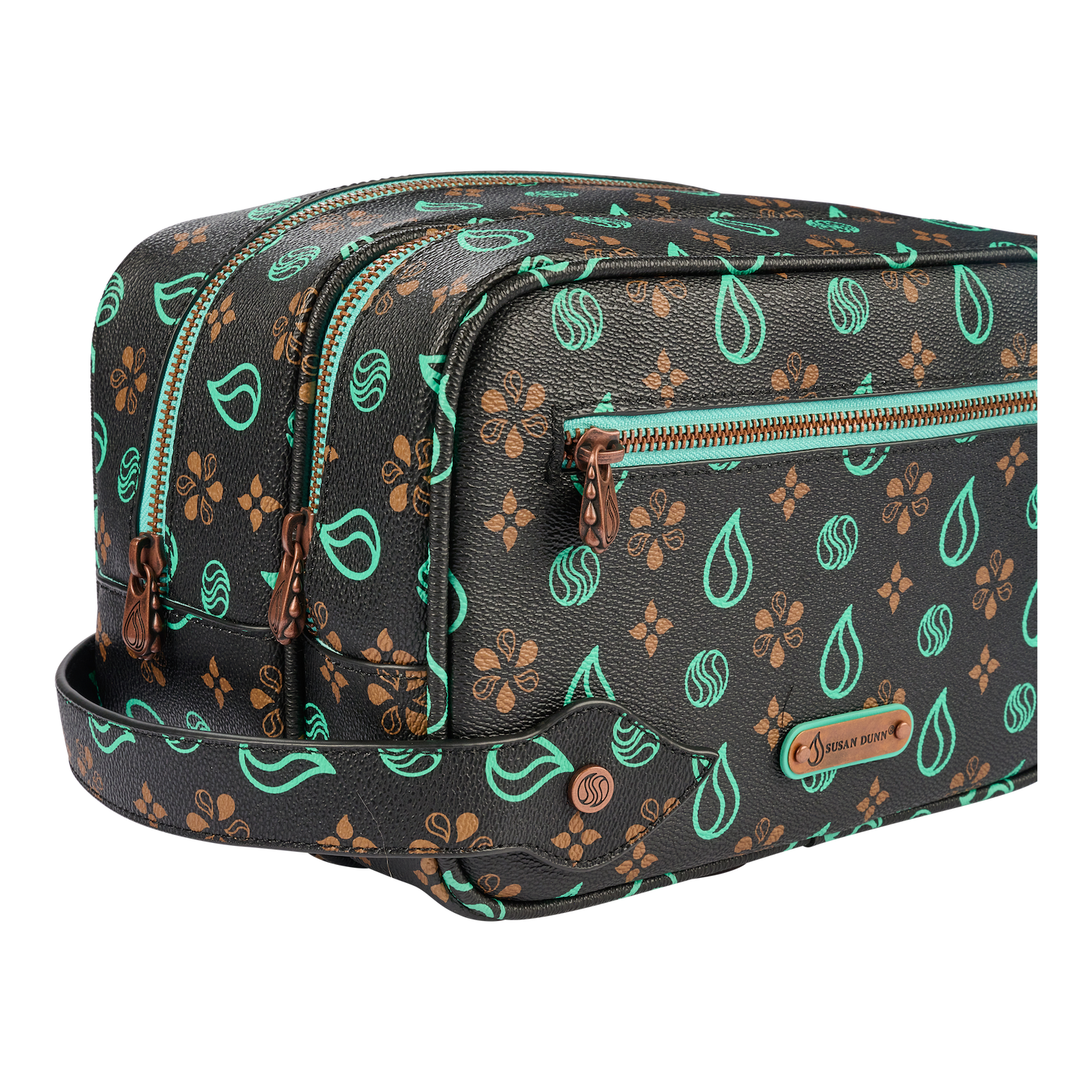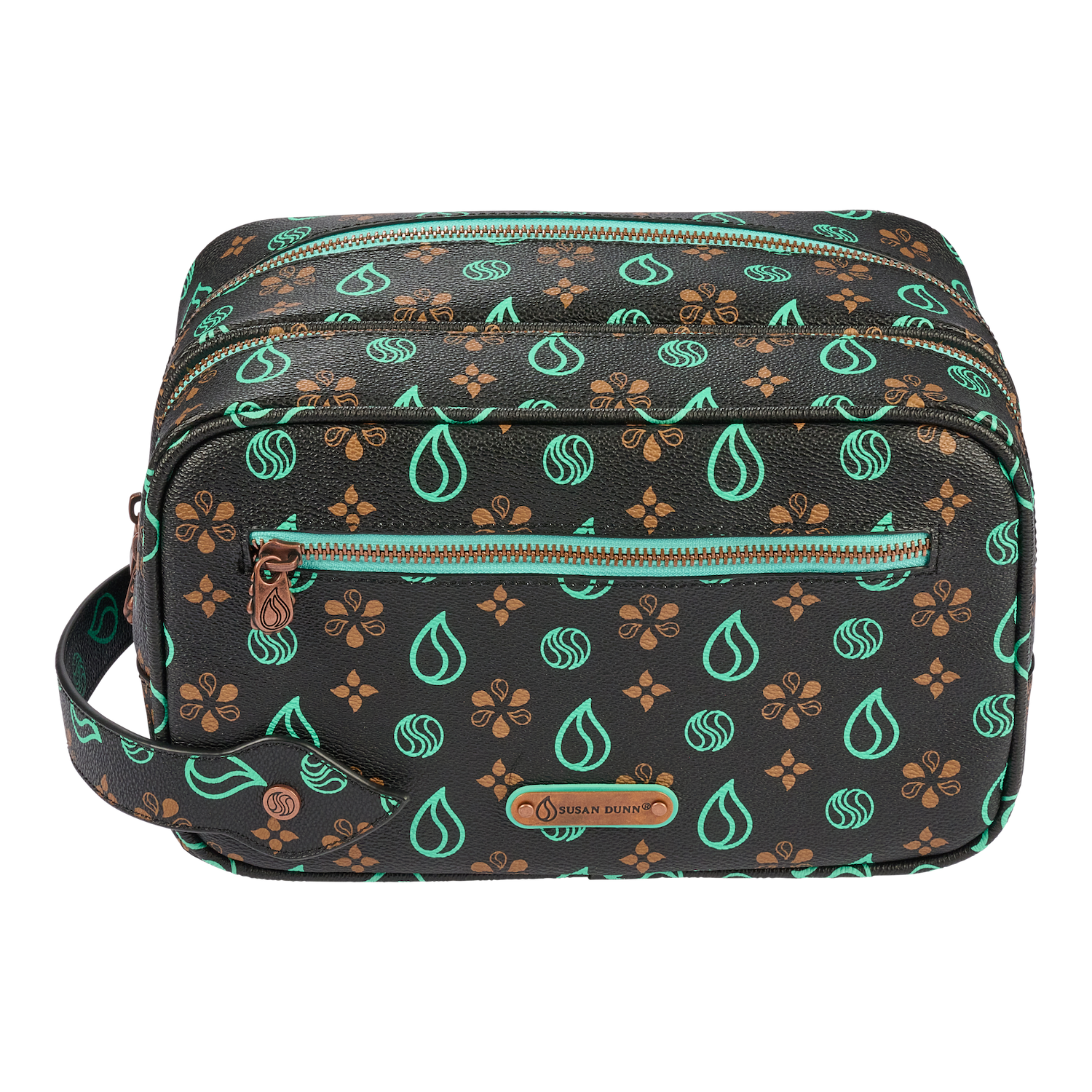 His or Hers, our Grand Toiletries Case may certainly be the most essential travel case you will ever discover. With Dual Top zippers, two generous compartments help separate your grooming, hair, make-up, and skin care items. The front exterior zipper area is perfect for quick access items. The front section boasts an interior zip pocket, and the handy back section elastic pocket serves as a useful catch all. A separate vinyl zip case is ideal for your supplements or smaller grooming items. Fashioned from iconic signature monogram canvas material with interior nylon linings sporting our glorious Waterfall design, crystal-clear vinyl linings enhance the compartment bottoms. Five special feet support and raise your vanity case off the counter to insure it remains dry from the elements. A side handle facilitates ease of handling and maneuvering. A special custom-made pillow fits inside the case snugly to keep its form when not in use. The icing is our lovely Waterfall zip cover that preserves and protects in storage and travel. We will exceed your expectations with this marvelously useful and stylish accessory necessity.